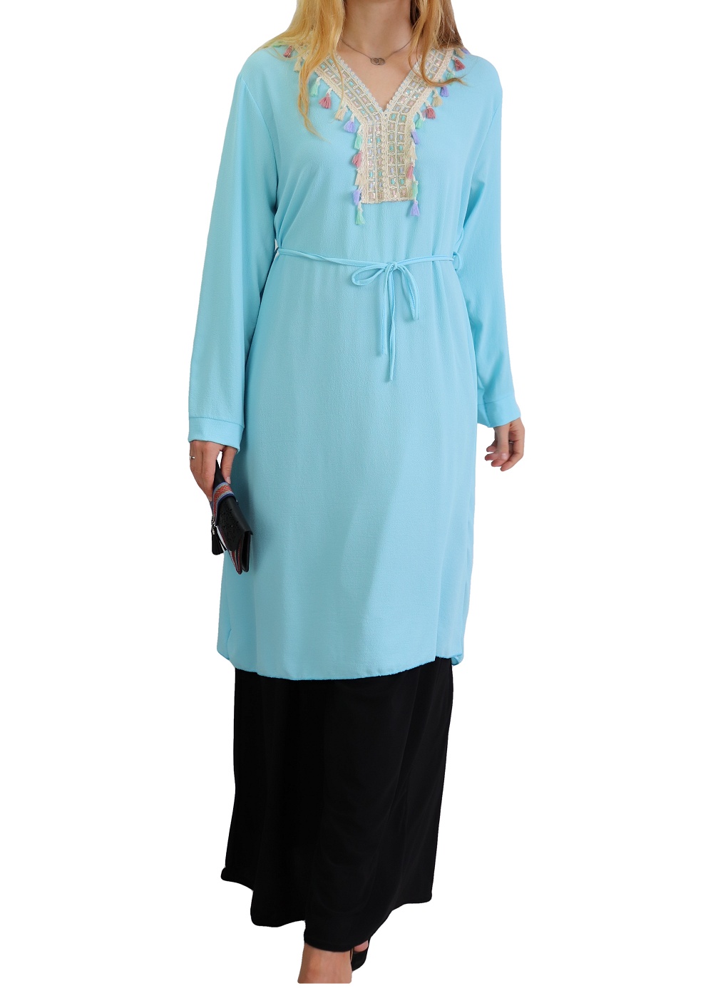 Tunique encolure brodée col V avec pompons (Vêtement femme) - Couleur Bleu ciel Vetement & Accessoire