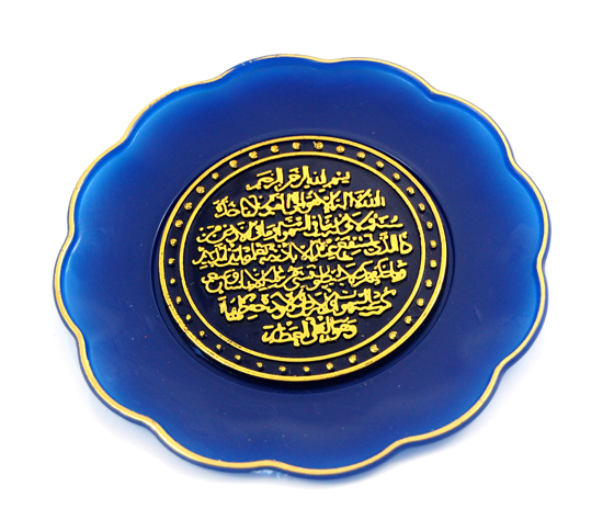 Assiette décorative en plastique de couleur bleu foncé avec 'Âyatu l-Kursî écrite en doré au centre.