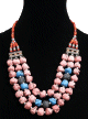 Collier ethnique artisanal trois rangs imitation pierres roses, noires, bleues, agrémentées de perles et d'armatures argentées - REF. 19014 (28.00 €)