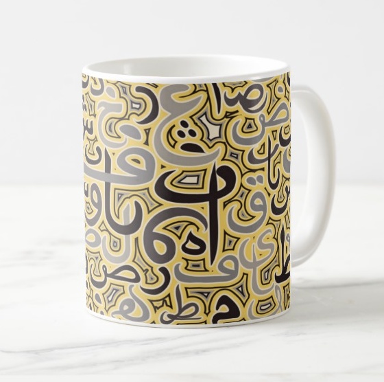 Tasse avec calligraphies artistiques de lettres arabes isolées et entrelacées... en noir et gris sur fond jaune...